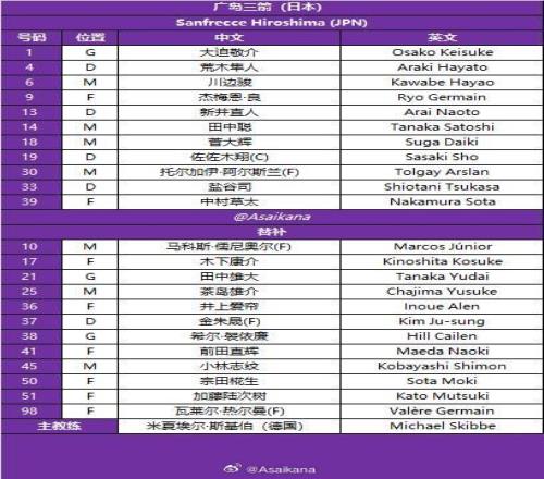广岛三箭首发:1-大迫敬介、4-荒木隼人、13-新井直人、19-佐佐木翔、33-盐谷司、6-川边骏、14-田中聪、18-菅大辉、30-阿尔斯兰、9-热尔曼-良、39-中村草太